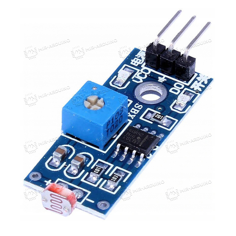 Датчик света применяется для контроля уровня освещенности. Представляет собой модуль аналогового датчика на основе фоторезистора. На схеме также предусмотрен компаратор. Датчик используется в проектах на базе Ардуино, связанных с регулировкой освещенности: подсветка смартфонов или планшетов, настройка света в системе «Умный дом». Степень освещения, при которой будет активироваться датчик, пользователь может настроить самостоятельно при помощи потенциометра. Имеются 4 выхода - питание, земля, цифровой и аналоговый.